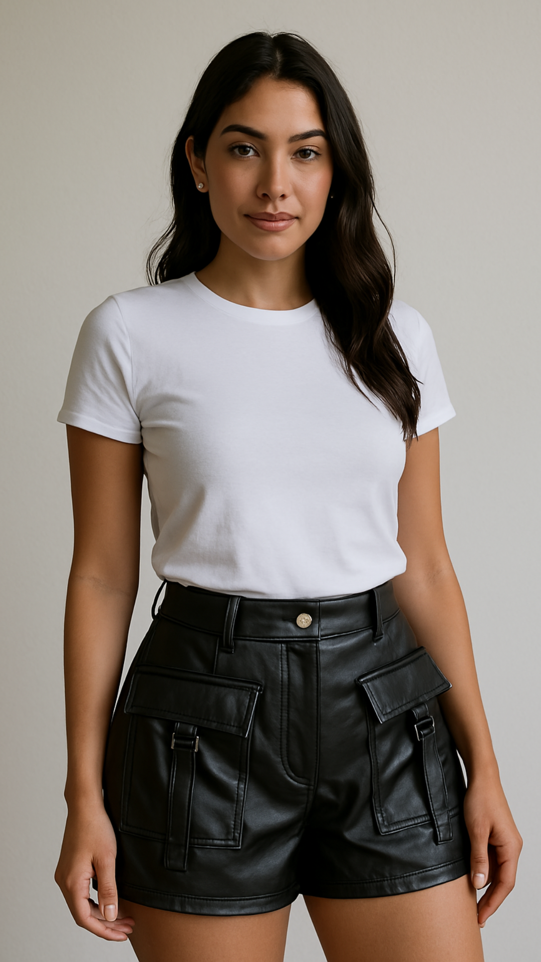 ¡Inspira tu estilo con estos shorts de piel ecológica tipo cargo! Podrás combinarlos fácilmente con cualquier prenda para un look moderno y sostenible. Perfecciona tu outfit con estos shorts cómodos y amigables con el medio ambiente. ¡Haz una declaración de moda con estos shorts únicos!